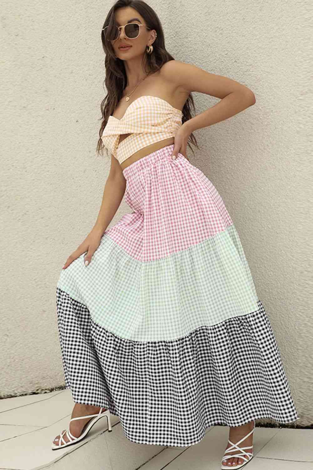 Plaid Strapless Top and Tiered Skirt Set