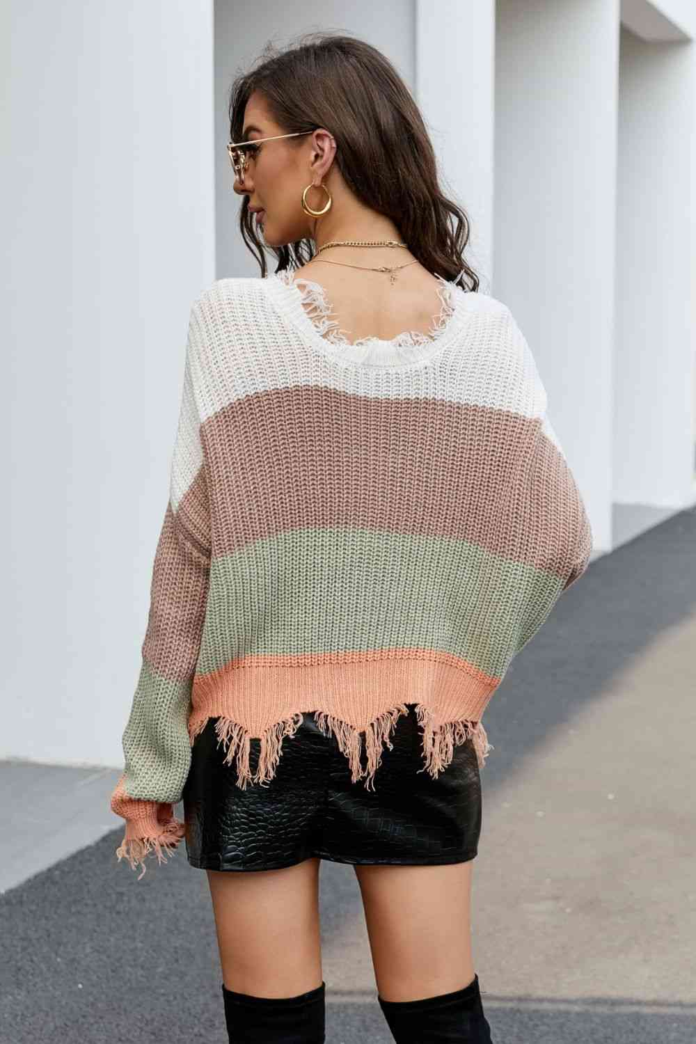 Striped Fringe Trim V-Neck Sweater